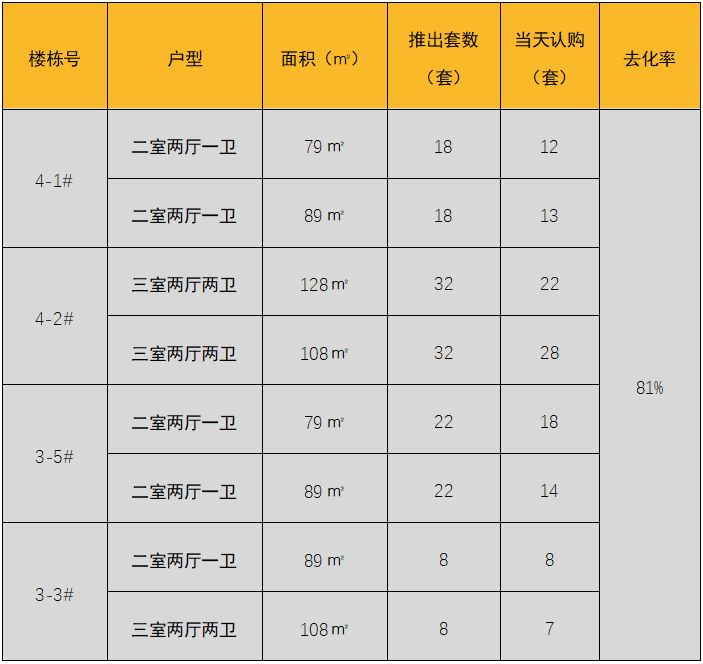 认购去化:81%。查城市、企、查地产数据、曲线公里范畴内有多个长儿园、小学、中学,客户定位:刚需刚改改善本次推出户型面积及开盘当天认购去化环境。